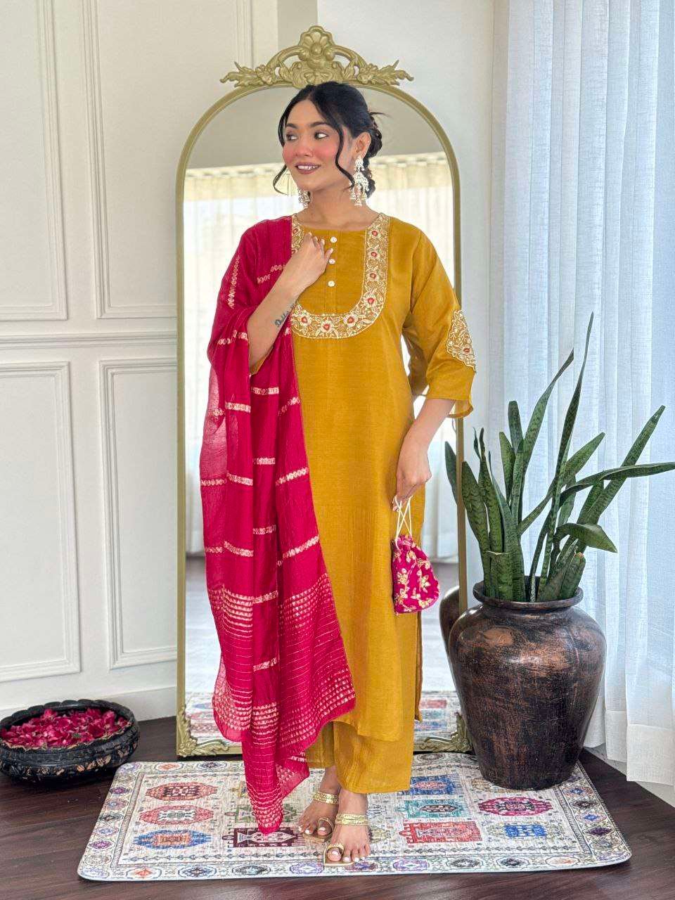 Bold, beautiful & ethnic in mustard gold and rani pink hues