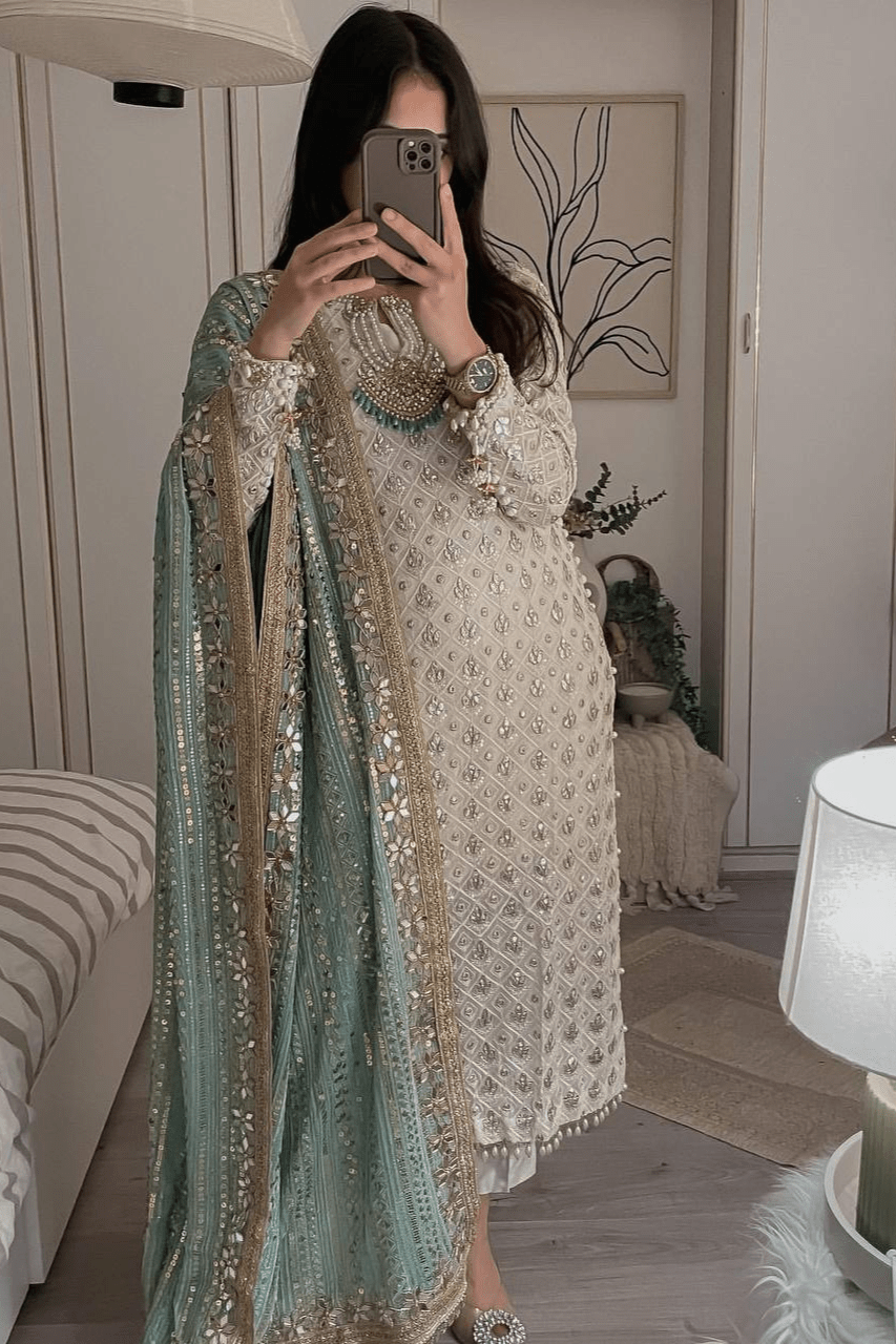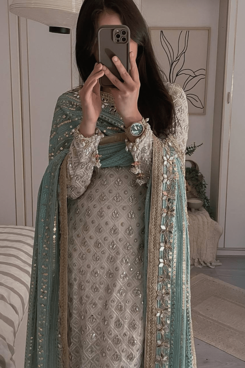 “Introducing our newest festival collection, exclusively from Kalodoro! Elevate your celebrations with our stunning ensemble crafted from luxurious georgette adorned with intricate heavy embroidery and sequence work. This top-bottom and dupatta set come fully stitched, offering you ready-to-wear glamour for your festive occasions. Experience the epitome of elegance and sophistication with Kalodoro’s signature craftsmanship. Make a statement and shine bright in our exquisite ensemble, designed to bring radiance to your festivities.”
